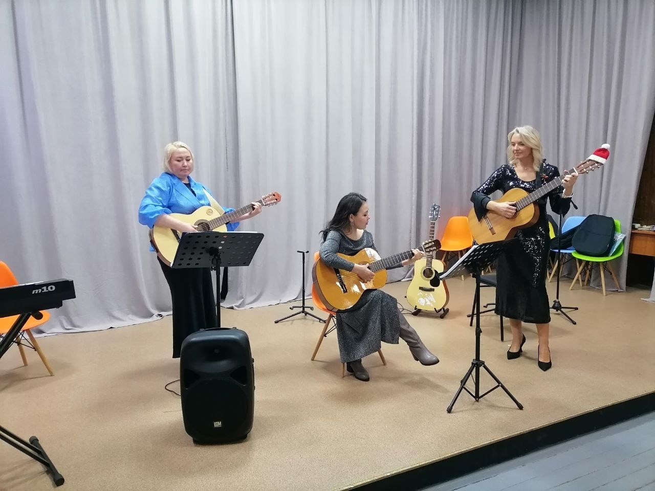 За год гитаристы и укулелисты заметно подтянулись, не только в росте, но и в игре на инструментах. Некоторые ребята попробовали в этом году освоить новые инструменты: электрогитары, барабаны и баян, и блестяще выступили на концерте. Много было и новичков, для которых выступление на сцене и вовсе стало дебютом.