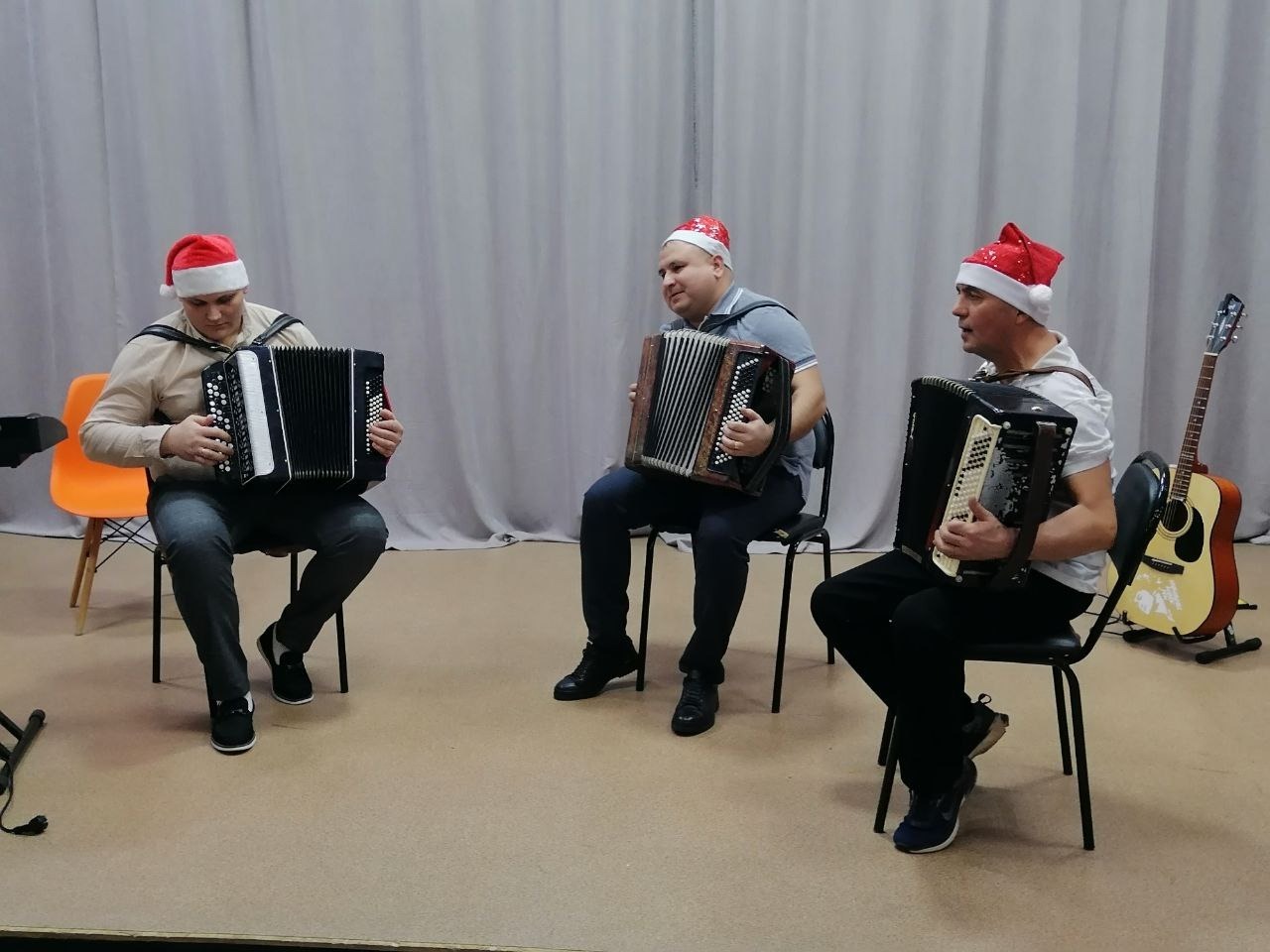 Ну а гитаристы, конечно, дали жару. Весь зал пел вместе с ними всем известные песни Виктора Цоя «Группа крови» и «Звезда по имени Солнце», ДДТ «Это всё», Жени Трофимова «Поезда» и другие. Покорила зрителей инструментальная версия песни «Аллилуйя». Ну а как же Новый год без зимних песен?! Прозвучали любимые песни «Кабы не было зимы», «Новогодние игрушки», «Ёлочка-ёлка лесной аромат», «Новый год к нам мчится». Было пронзительно до мурашек, когда на сцене собирались все ученики студии с гитарами. В едином духе, в едином порыве, в едином ритме!