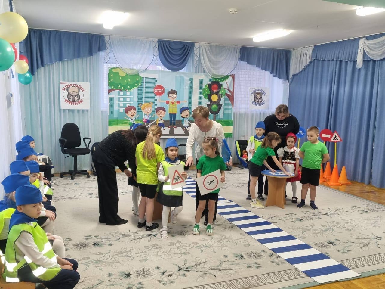 Затем ведущая объявила начало викторины и веселых конкурсов. Родители вместе с детьми приняли участие в игре «Неправильный знак», проверяя знания дорожных знаков. Затем последовала захватывающая эстафета «Пристегни ребенка», где каждый участник показал свою ловкость и внимательность, стараясь сделать всё правильно и быстро.