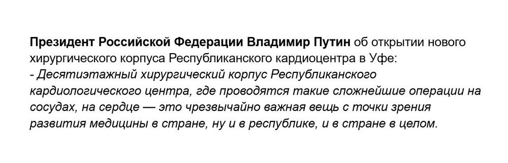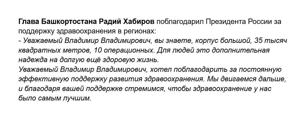 Стенограмма события с официальной портала Президента РФ Путина В.В. доступна по ссылке: Открытие объектов здравоохранения в регионах